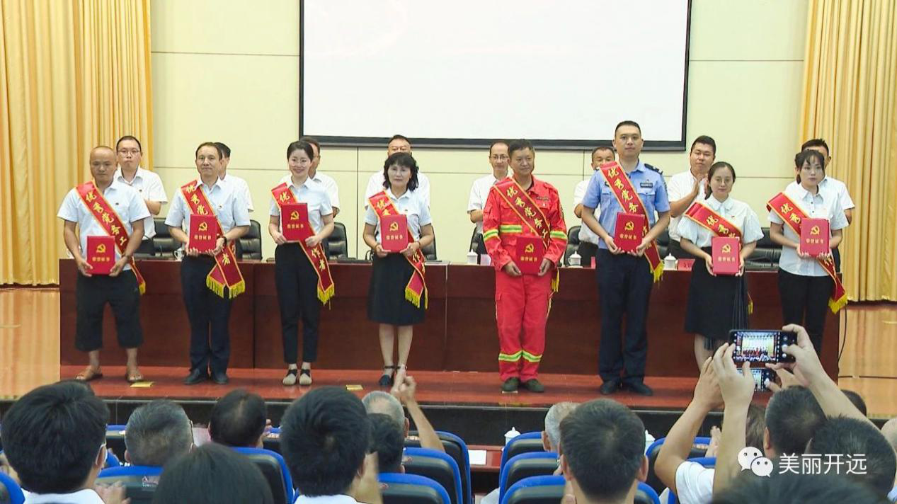 孔劲松、解凌云等在主席台就坐的领导为灵泉街道泸江社区党总支等10个先进基层党组织代表、毕永林等20名优秀共产党员代表、徐进华等20名优秀党务工作者代表、国洪经贸有限公司党支部等3个“两新”党组织代表、李文祥等3名“两新”党组织书记代表、付金梅等2名“两新”党建工作指导员代表进行颁奖。