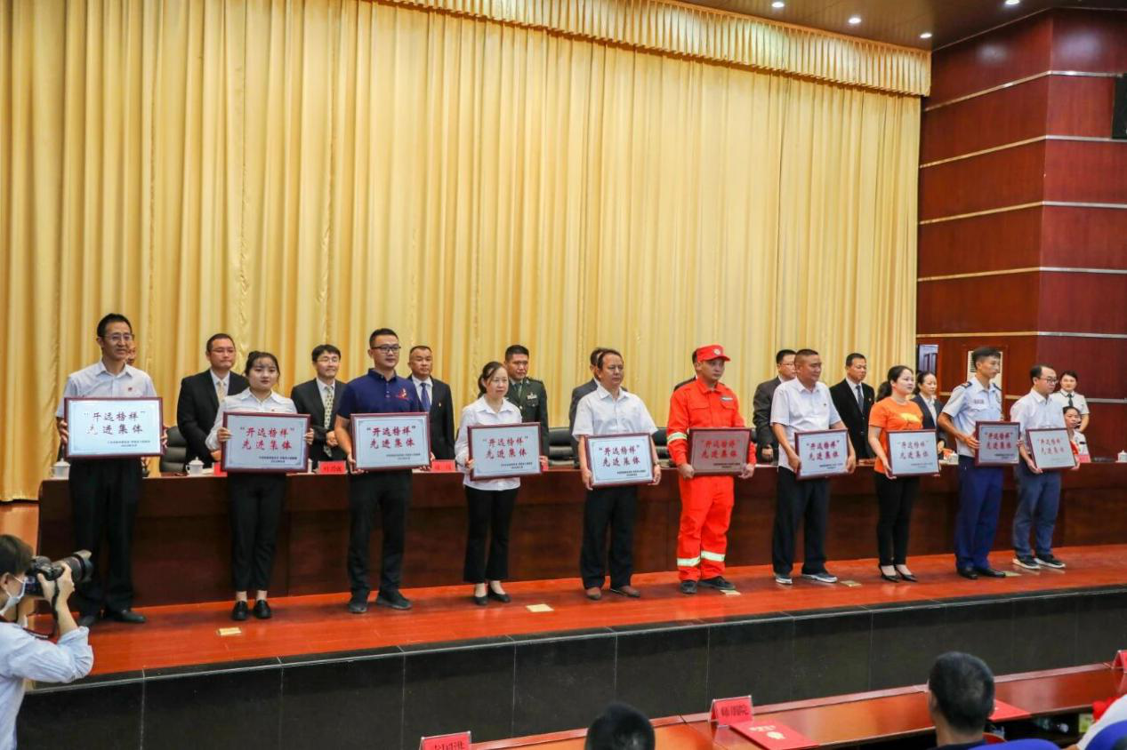 市委副书记、市长宋文辉宣读表彰决定,决定授予开远市援助湖北医疗队等10个集体“‘开远榜样’先进集体”称号,授予杨茹云等30名同志“‘开远榜样’先进个人”称号,授予李忠永等15名同志“开远市劳动模范”称号,授予秦剑波等4名同志“开远市先进工作者”称号。