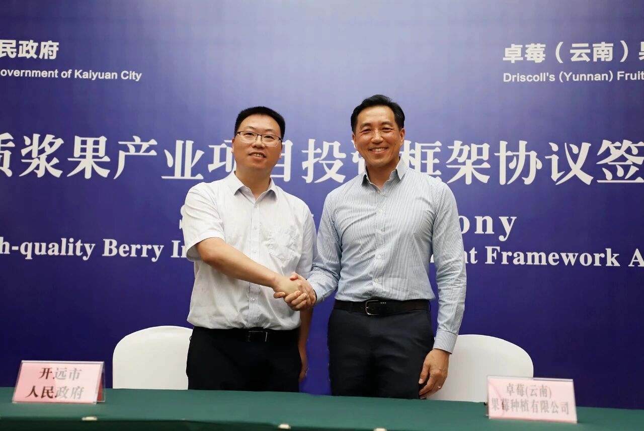 7月21日下午,开远市人民政府与卓莓(云南)果莓种植有限公司举行合作协议签约仪式。市委副书记、市人民政府市长宋文辉,市委副书记罗杰,市人民政府副市长李树锋,开远市国家现代农业产业园区管委会主任马旭,卓莓全球副总裁、中国区总经理田仁杰,卓莓中国区生产及运营总监卢卡斯弗劳尔斯,卓莓(云南)农场发展经理聂浩,卓莓(云南)公共事务经理苏晓晖参加签约仪式。