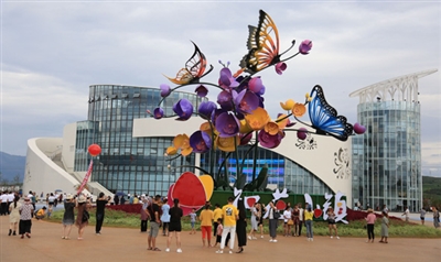 知花小镇7月中旬正式开放以来,吸引了很多游客到此参观游玩,热闹的氛围和与日俱增的人气也为小镇带来了生机和活力。每当夕阳西下、华灯初上时,知花小镇交易会展中心的广场和附近的空地上,聚集了大量的游客和村民到此休闲娱乐。