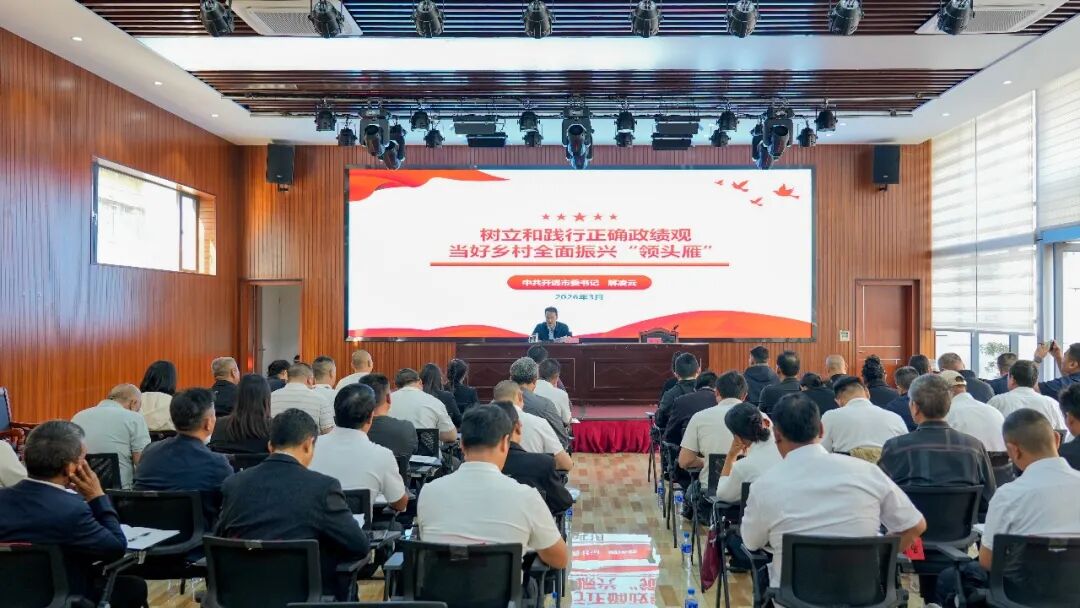 3月20日,市委书记解凌云在市“两新”组织党群服务中心凤凰花会议厅为全市行政村党总支书记讲授专题党课,强调要深入学习贯彻习近平总书记关于树立和践行正确政绩观及“三农”工作和基层党建的重要论述,当好乡村全面振兴“领头雁”。市委常委、市委组织部部长许逵主持会议。
