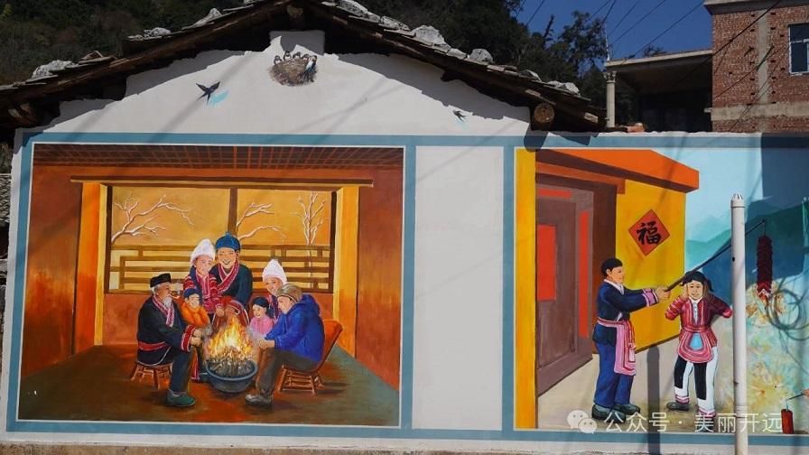 走进阿痴村,村庄宁静和谐,道路干净整洁,一幅构图巧妙、满是幸福的“美景画”映入我们眼帘——村民房屋的外墙上画着田园风光,一对彝族男女站在田间,仿佛在诉说着新一年的美好期盼。墙角处,几位身着民族服饰的村民悠闲地坐在石阶上,他们有说有笑,互相分享着家中趣事……此情此景,把乡村生活的恬静惬意展现得淋漓尽致。