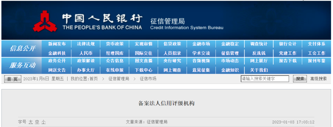 1月3日,中国人民银行征信管理局更新数据,截至2023年1月3日,全国备案法人信用评级机构共计54家。