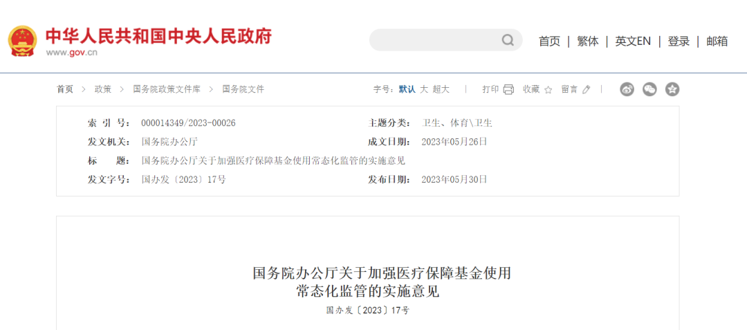 国务院办公厅印发《关于加强医疗保障基金使用常态化监管的实施意见》