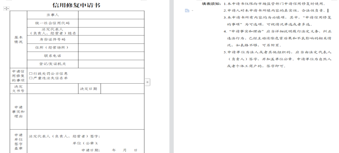 市场监管总局依据印发的《规定》办理有关经营主体的信用修复申请,并通过总局网站发布了信用修复指南和信用修复申请书、守信承诺书、送达地址确认书等信用修复申请文书样本,为经营主体申请信用修复提供指引,助力经营主体重塑信用,提升信用水平与市场竞争力。