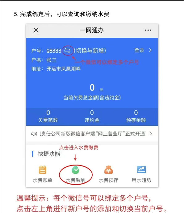 开远市自来水有限责任公司新版微信客户端“网上营业厅”正式开通,经过系统研发、数据库调整、系统测试和上线试运行等多个过程,在原有功能基础上,完善了查询功能,新增了网上水费预存、历史用水量查看、用水报装、过户销户等功能板块,涵盖了自来水营业窗口全业务流程。新老用户只需打开“开远市自来水有限责任公司”微信公众号,进行认证绑定,即可开启网上营业厅的体验,真正实现线上申请线下办理的全新业务体验。